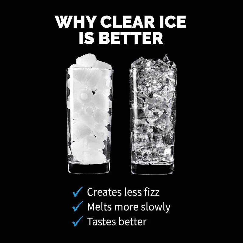 - Clear ice reduces excess carbonation and melts more slowly, making it perfect for cocktails, scotch, soda and more