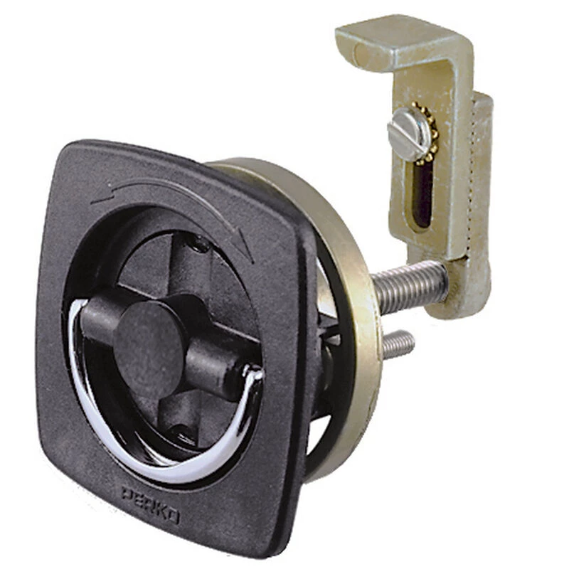 These Perko flush mounted latches feature a two-way adjustable cam and mounting ring to simplify installation and adapt to a wide variety of applications. The offsett cam of this model has a vertical range from 3/8″—3″ to engage the a strike and allows the latch to compensate for different deck and bulkhead thicknesses. A second adjustment allows the swing of the cam to be increased or descreased to match the relationship between the latch and strike.These latches install quickly in a 2″ hole and can be secured to doors and hatches as thin as 1/4″ and as thick as 1 1/8″. The Black polymer body provides detents to hold latch in OPEN and CLOSED positions and is deep enough for the chrome-plated zinc handle to fold flat and out of the way. Reduce trip and snag hazards with an extremely adaptable Perko flush latch.