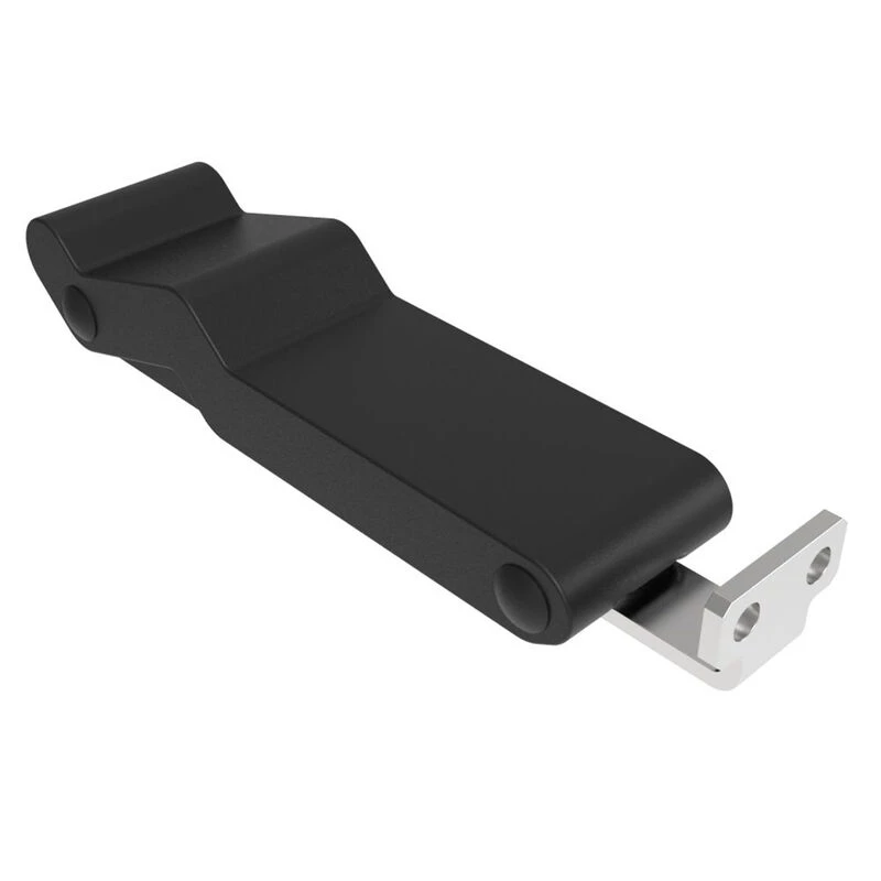 This draw latch features a flexible, low-profile, over-center design. Composite materials prevent corrosion, cushion against impact and accommodate against misalignment. Latch is thermoplastic elastomer. Link and bushings are glass reinforced nylon. Right-angle, stainless steel keeper and bracket. Black.